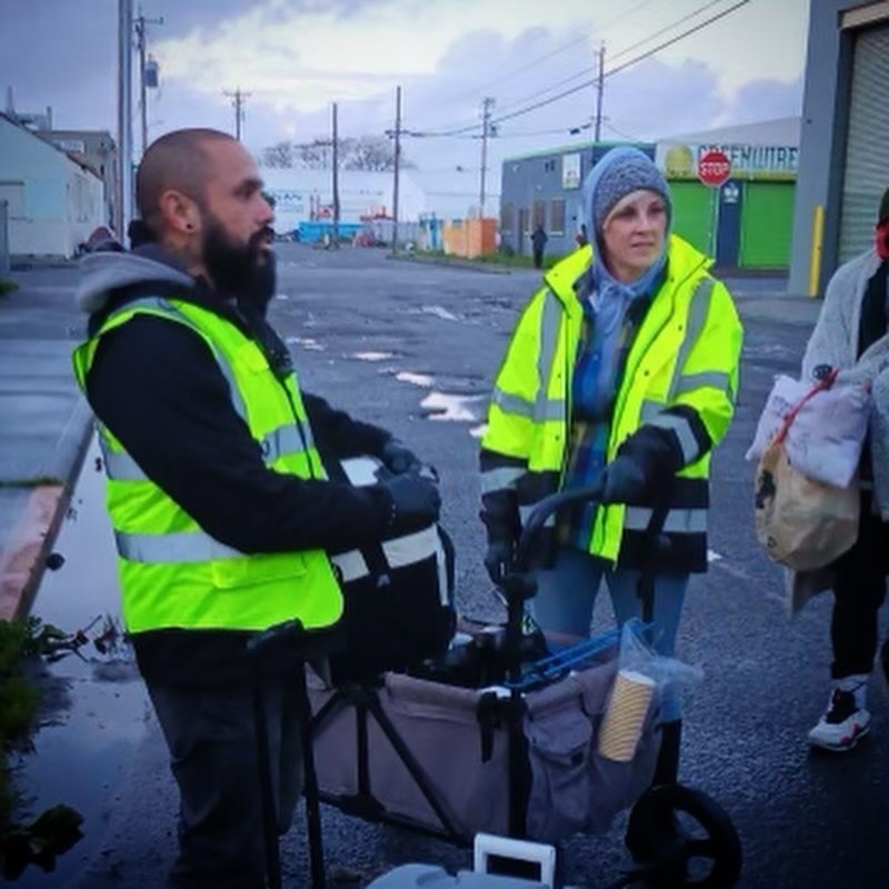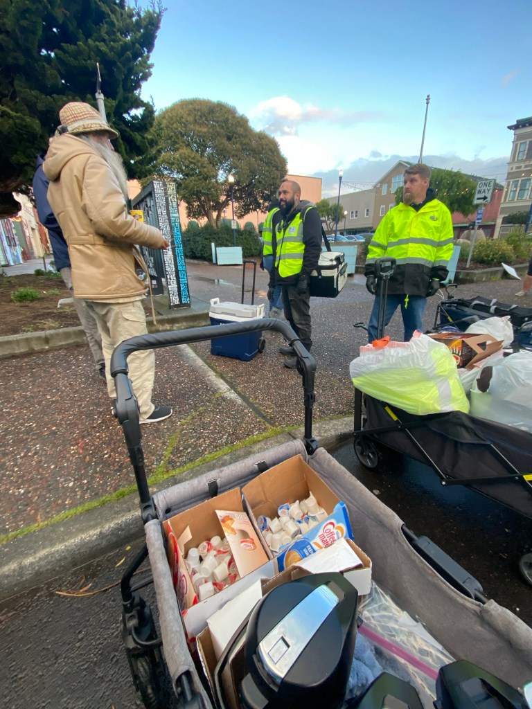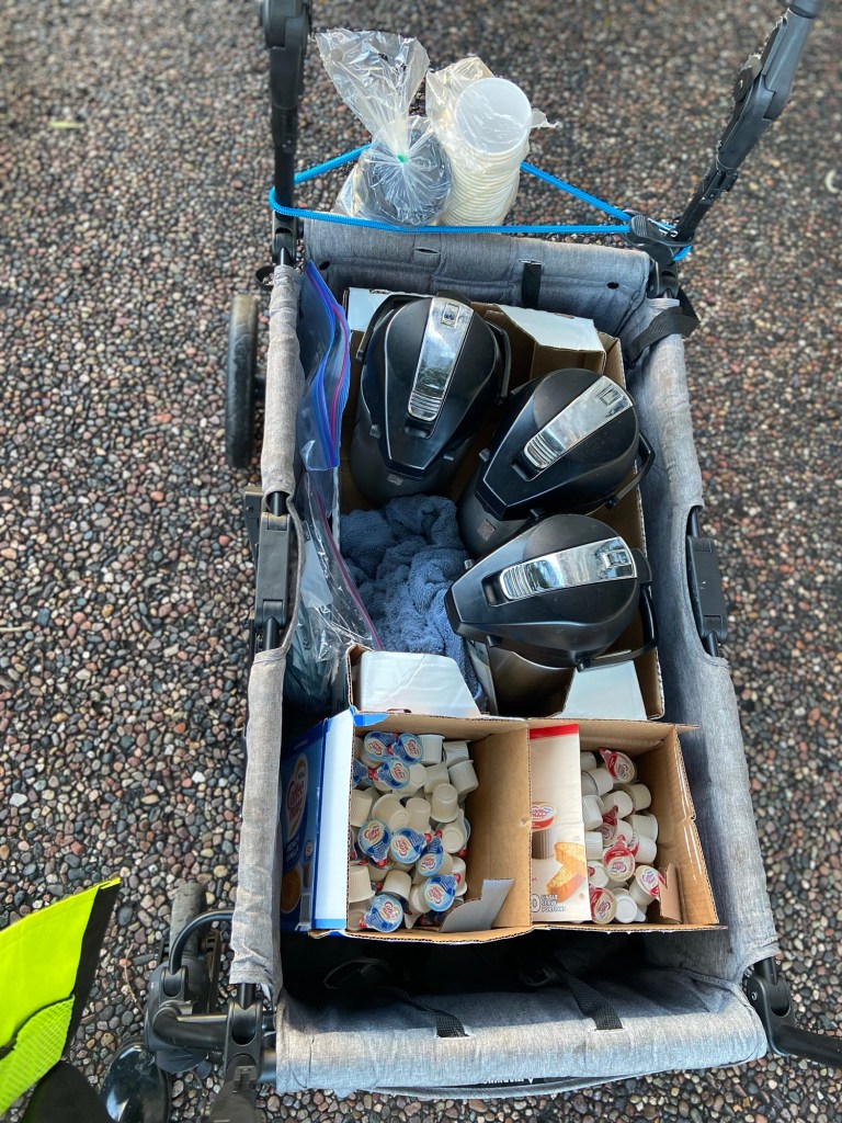 One of our family of volunteers and supporters loaned us their cart to bring with us to carry the coffee, cups and creamers. One of our other family of volunteers showed up with a brand new cart (that they then donated to us!) to pull the jackets, blankets and the boxes full of hand warmers that were donated as well. Stacie put in a request to the owner of her company to go into one of their locations and brew coffee after hours, and not only did she say yes, she offered above and beyond what was asked to make it easier for us.